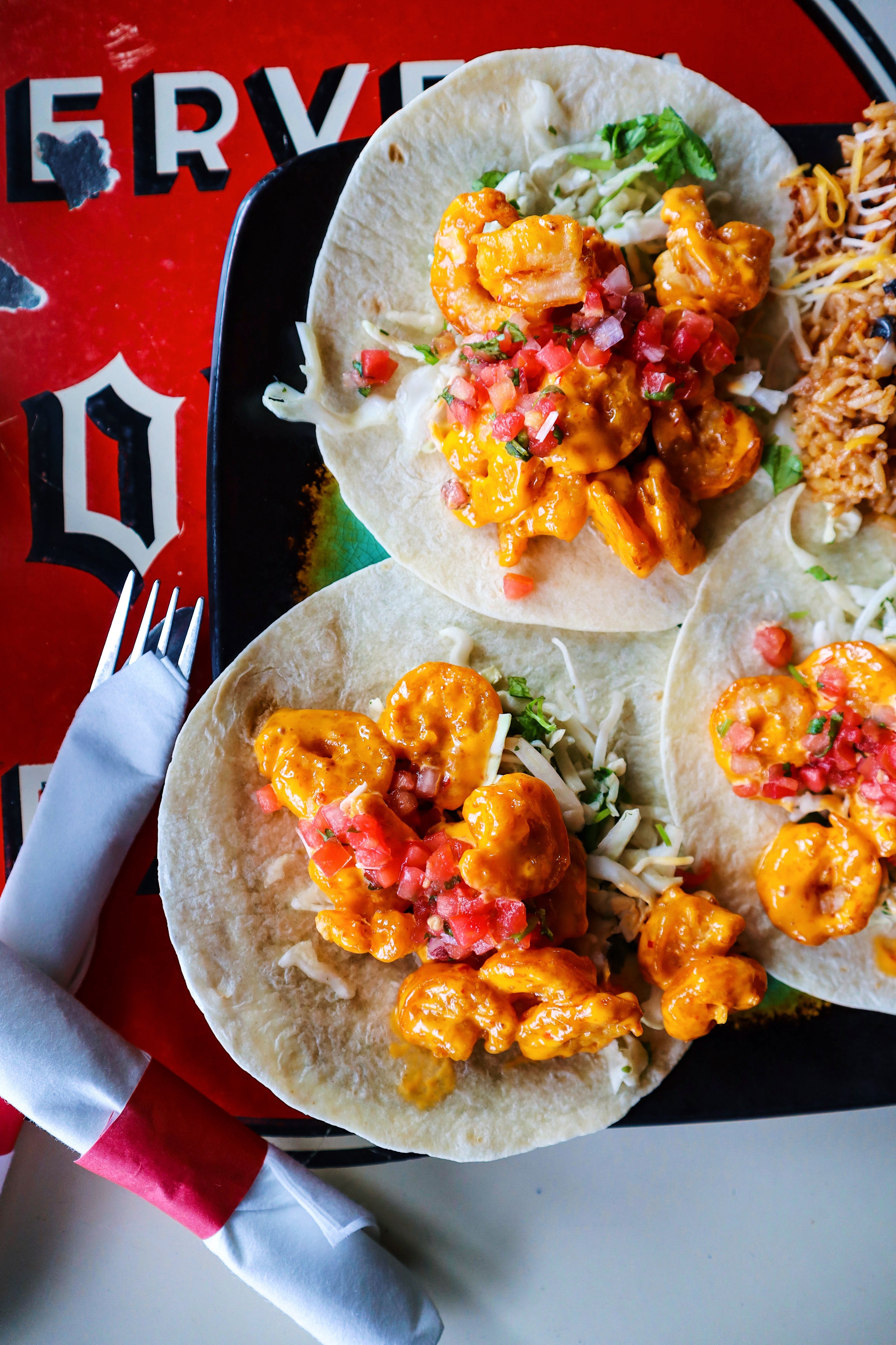 Order NowCrispy homestyle shrimp tossed in our house Bang Bang sauce. Tacos come with fiesta rice, offered with soft flour or a crispy corn shell, or upgrade to Queso Crunch Shell (both melted together with queso!)