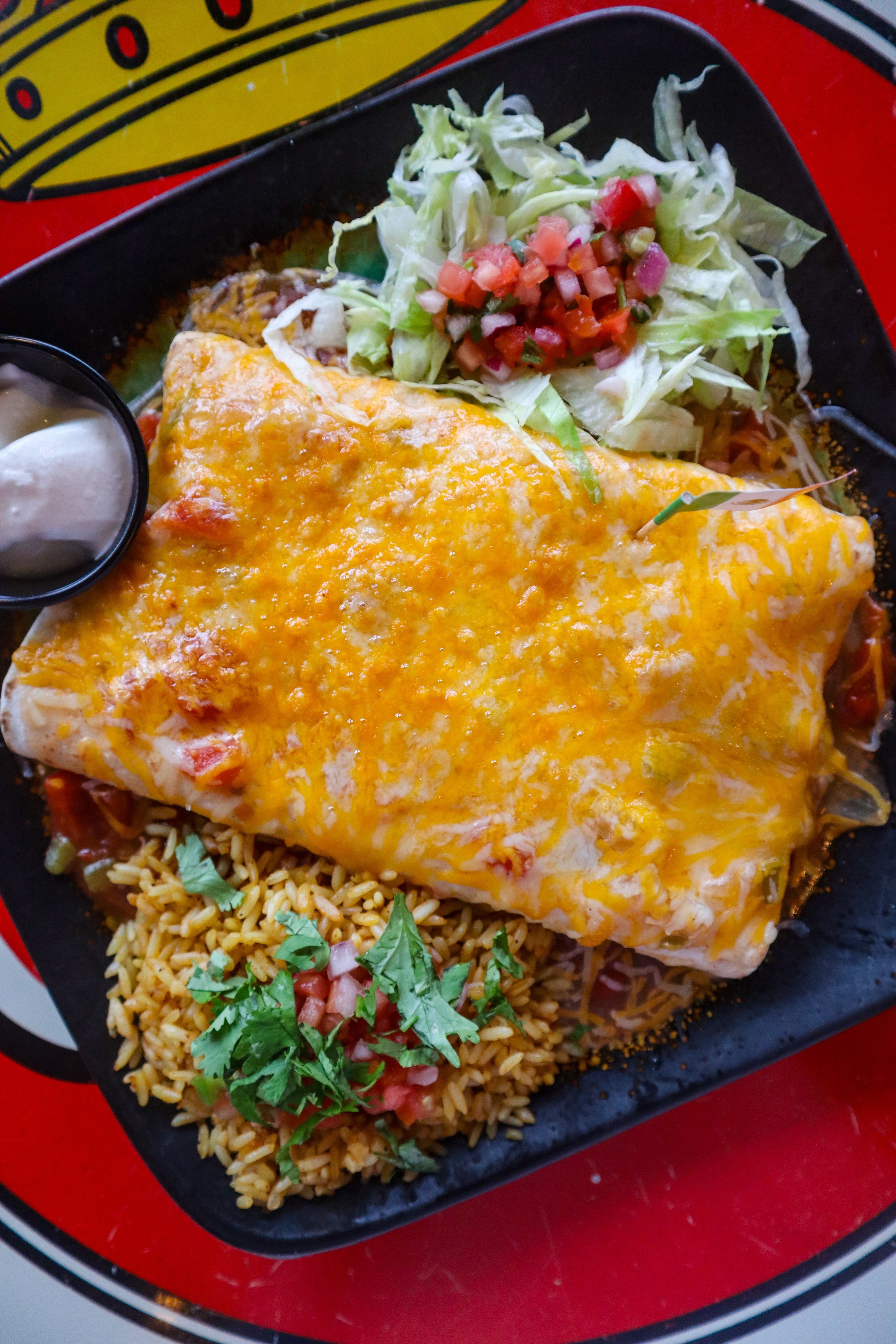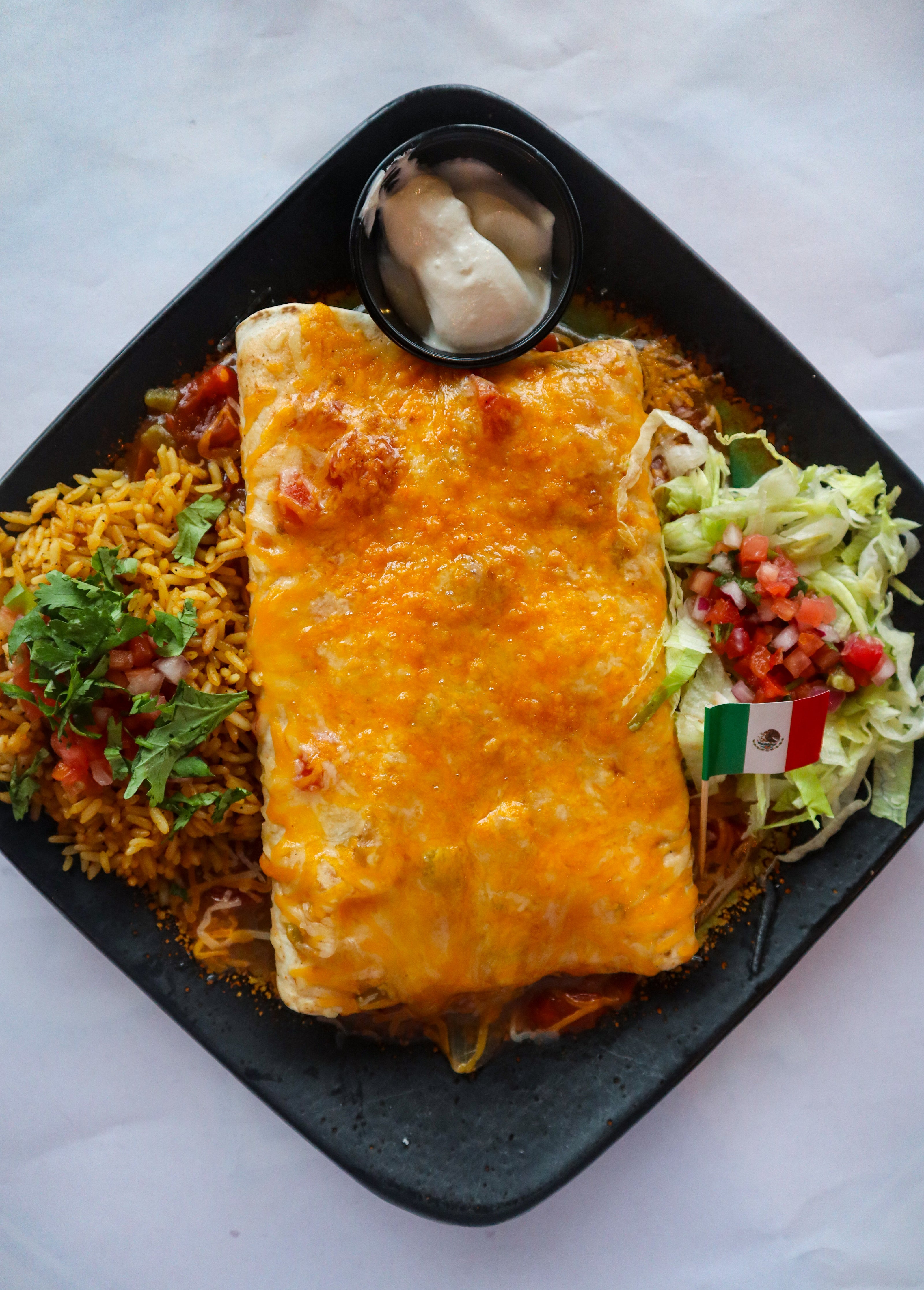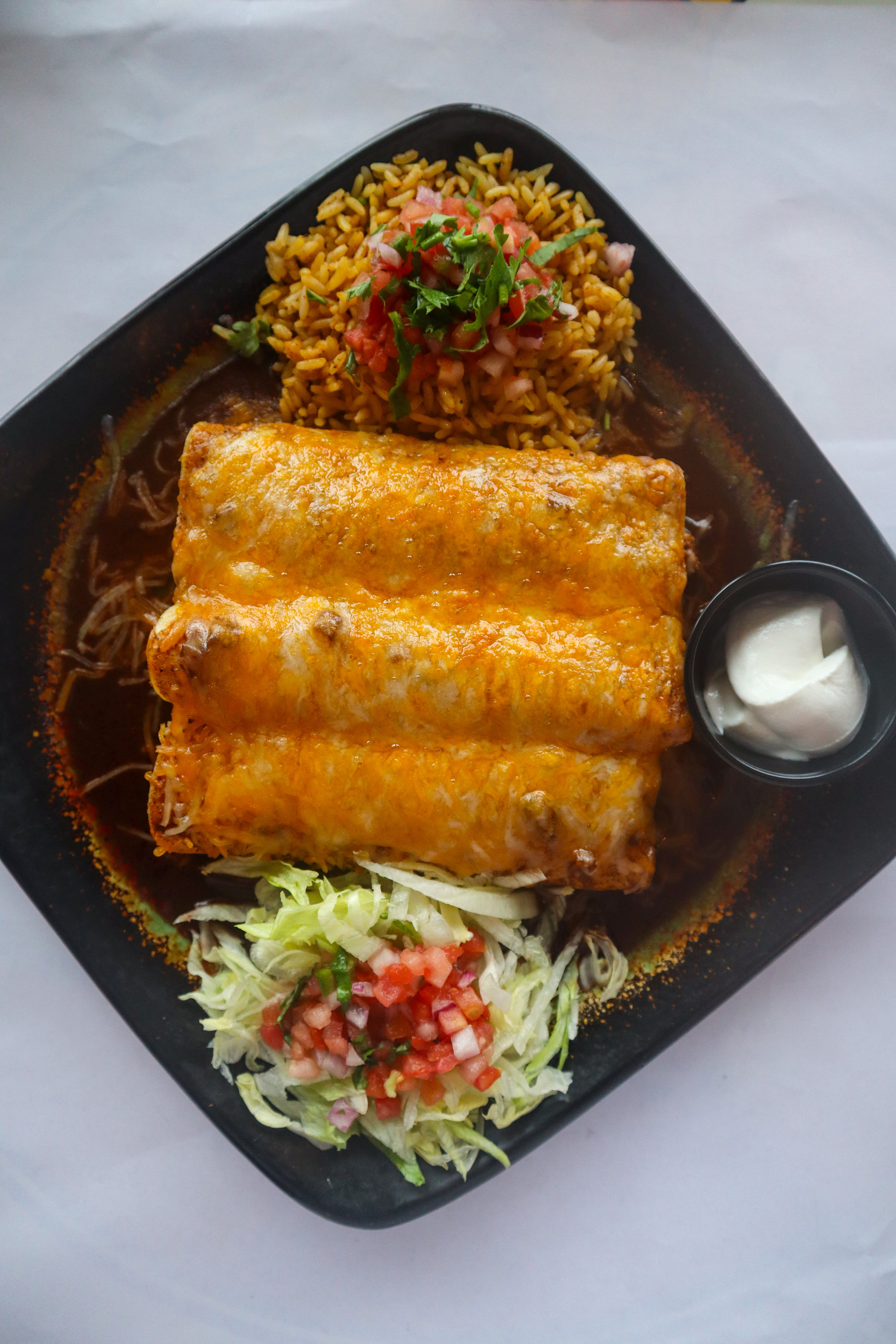 Order NowLoaded with ground beef, enchilada sauce and cheddar cheese. Baked in white corn tortillas & served with fiesta rice.