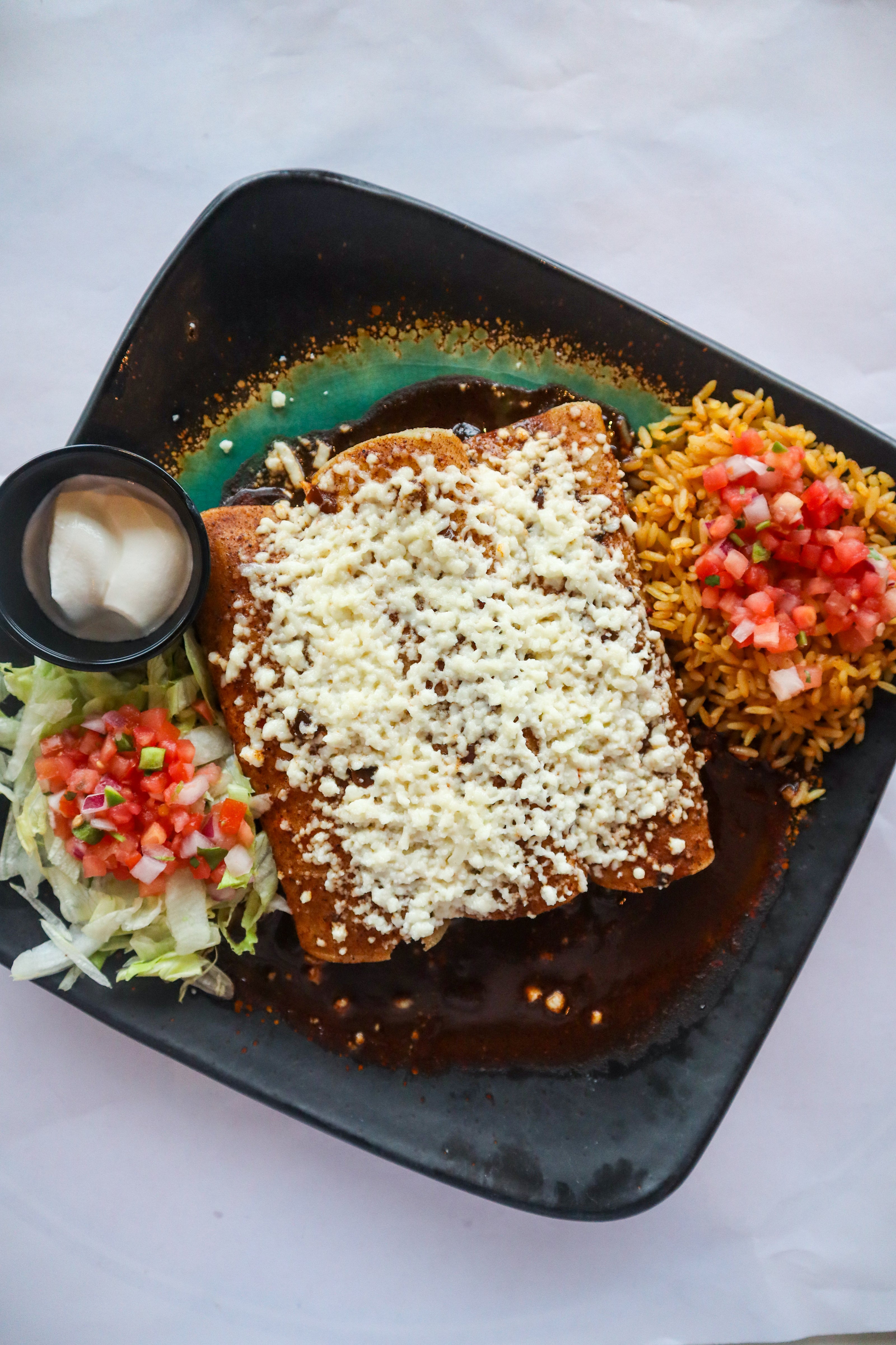 Order NowGrilled portobello mushrooms, onions & peppers topped with enchilada sauce & queso fresco. Baked in white corn tortillas & served with fiesta rice.