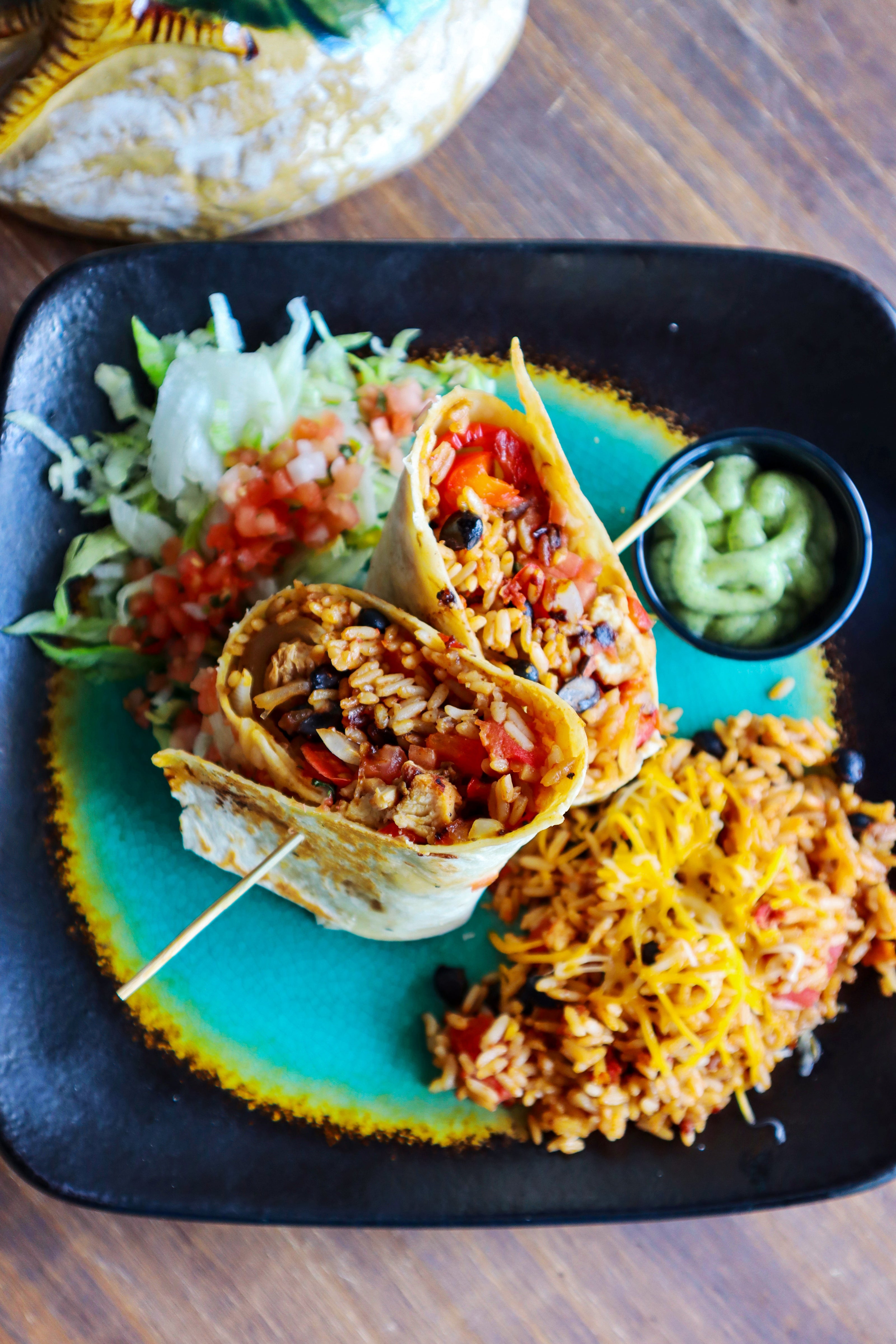 Order NowStuffed with avovado, pico de gallo, grilled peppers and onions & your choice of grilled chicken, steak, or blackened shrimp. Made with a jumbo flour tortilla and served with fiesta rice.